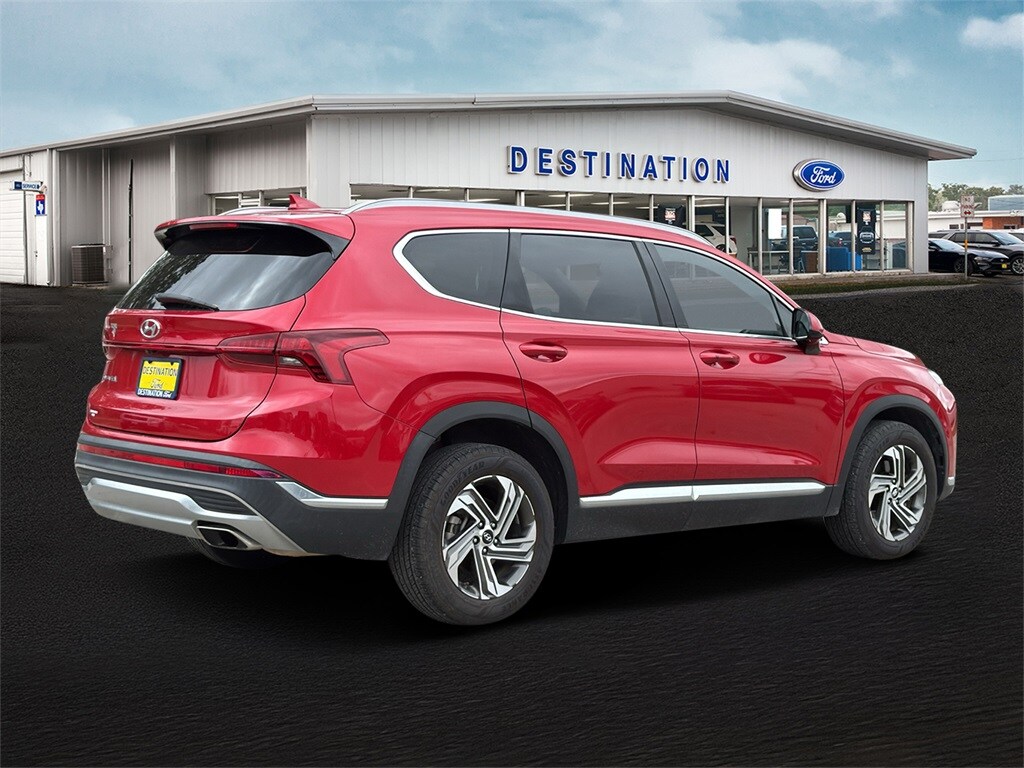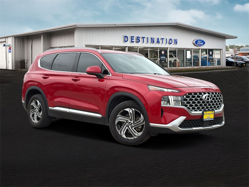 This 2022 Hyundai Santa Fe SEL in Calypso Red comes with the following features: 2.5L I4 8-Speed Automatic with SHIFTRONIC FWD Option Group 01, Beige Cloth, 18" x 7.5J Alloy Wheels, 4-Wheel Disc Brakes, 6 Speakers, ABS brakes, Air Conditioning, Alloy wheels, AM/FM radio: SiriusXM, Apple CarPlay & Android Auto, Auto High-beam Headlights, Axle Ratio: 3.798, Brake assist, Bumpers: body-color, Carpeted Floor Mats, Delay-off headlights, Driver door bin, Driver vanity mirror, Dual front impact airbags, Dual front side impact airbags, Electronic Stability Control, Emergency communication system, Exterior Parking Camera Rear, Four wheel independent suspension, Front anti-roll bar, Front Bucket Seats, Front Center Armrest, Front reading lights, Fully automatic headlights, Heated door mirrors, Heated Front Bucket Seats, Heated front seats, Illuminated entry, Low tire pressure warning, Occupant sensing airbag, Outside temperature display, Overhead airbag, Overhead console, Panic alarm, Passenger door bin, Passenger vanity mirror, Power door mirrors, Power driver seat, Power steering, Power windows, Radio: AM/FM Display Audio, Rear anti-roll bar, Rear seat center armrest, Rear window defroster, Rear window wiper, Remote keyless entry, Roof Rack Cross Bars, Security system, Speed control, Speed-sensing steering, Split folding rear seat, Spoiler, Steering wheel mounted audio controls, Tachometer, Telescoping steering wheel, Tilt steering wheel, Traction control, Trip computer, Variably intermittent wipers, and YES Essentials Stain-Resistant Cloth Seat Trim.