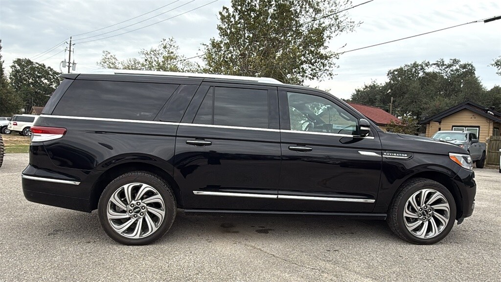 This 2023 Lincoln Navigator L Reserve in Black Metallic comes with the following features: V6 10-Speed Automatic RWD Equipment Group 200A Reserve, 14 Speakers, 3.73 Axle Ratio, 3rd row seats: split-bench, 4-Wheel Disc Brakes, ABS brakes, Active Park Assist 2.0 Delete, Adaptive suspension, Adjustable pedals, Air Conditioning, Alloy wheels, AM/FM radio: SiriusXM with 360L, Audio memory, Auto High-beam Headlights, Auto Start-Stop Technology, Auto tilt-away steering wheel, Auto-dimming door mirrors, Auto-dimming Rear-View mirror, Auto-leveling suspension, Automatic temperature control, Bodyside moldings, Brake assist, Bumpers: body-color, Compass, Delay-off headlights, Driver door bin, Driver vanity mirror, Driver's Seat Mounted Armrest, Dual front impact airbags, Dual front side impact airbags, Electronic Stability Control, Emergency communication system: 911 Assist, Exterior Parking Camera Rear, Four wheel independent suspension, Front anti-roll bar, Front Bucket Seats, Front dual zone A/C, Front fog lights, Front reading lights, Fully automatic headlights, Garage door transmitter, Genuine wood dashboard insert, Genuine wood door panel insert, Hands-Free Liftgate Delete, Head restraints memory, Heads-Up Display, Heated door mirrors, Heated front seats, Heated rear seats, Heated steering wheel, HVAC memory, Illuminated entry, Leather steering wheel, Low tire pressure warning, Memory seat, Navigation system: Connected Navigation (3-year trial), Occupant sensing airbag, Outside temperature display, Overhead airbag, Overhead console, Panic alarm, Passenger door bin, Passenger seat mounted armrest, Passenger vanity mirror, Pedal memory, Power adjustable rear head restraints, Power door mirrors, Power driver seat, Power Liftgate, Power moonroof: Panoramic Vista Roof, Power passenger seat, Power steering, Power windows, Prem Lthr Auto Htd/Ventiltd Perfect Position Seats, Radio data system, Radio: Revel AM/FM/HD/MP3 Audio System, Rain sensing wipers, Rear air conditioning, Rear anti-roll bar, Rear audio controls, Rear reading lights, Rear window defroster, Rear window wiper, Reclining 3rd row seat, Remote keyless entry, Security system, SiriusXM w/360L, Speed control, Speed-sensing steering, Speed-Sensitive Wipers, Split folding rear seat, Spoiler, Steering wheel memory, Steering wheel mounted audio controls, SYNC 4 Communications & Entertainment System, Tachometer, Telescoping steering wheel, Tilt steering wheel, Traction control, Trip computer, Turn signal indicator mirrors, Variably intermittent wipers, Ventilated front seats, Ventilated rear seats, Voice-Activated Touchscreen Navigation System, and Wheels: 22" Bright Machined Aluminum.